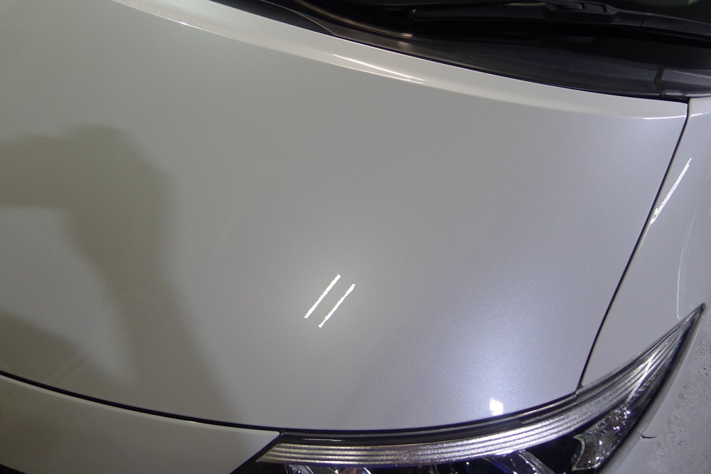 傷など目立ちにくいホワイトカラーですが水垢や洗車傷が入っています