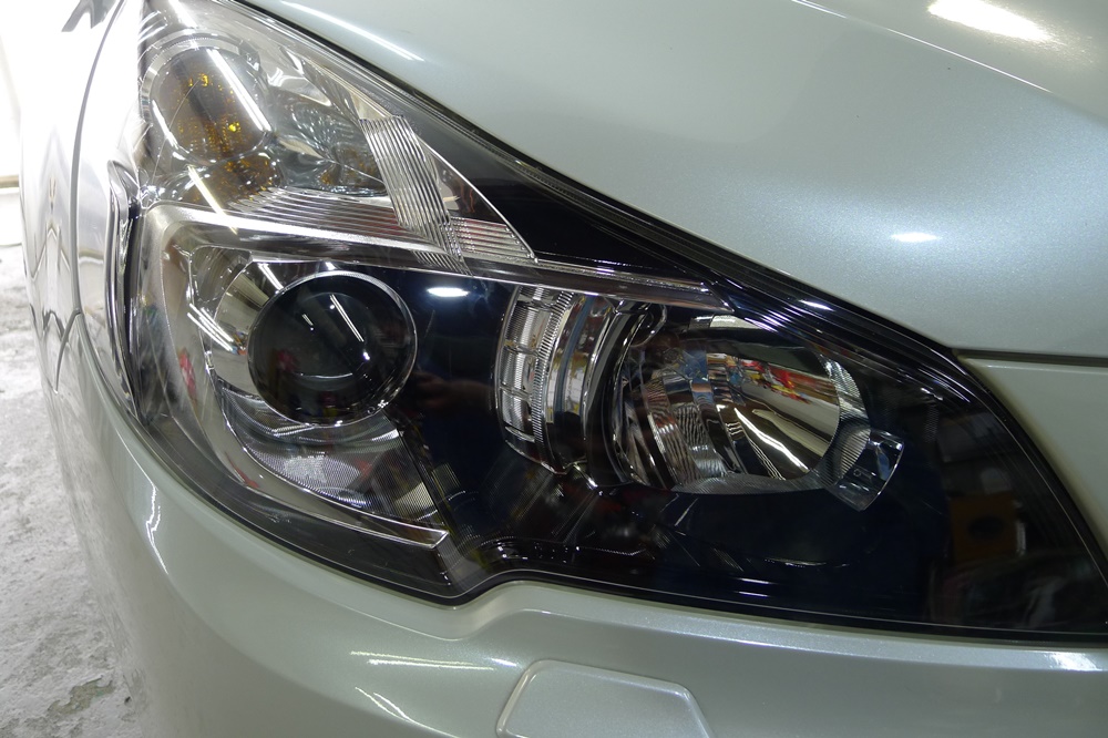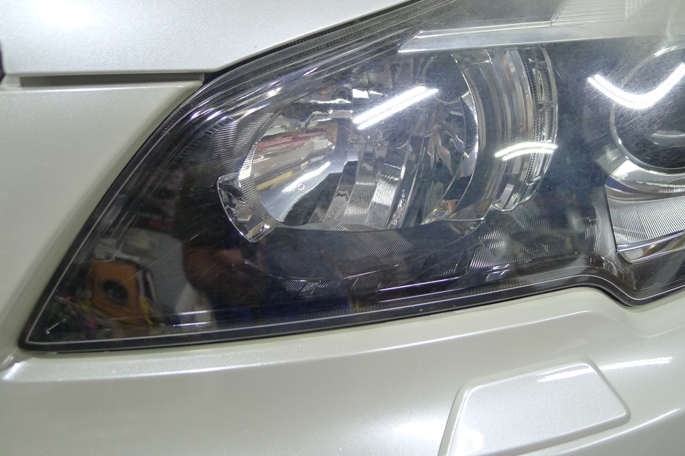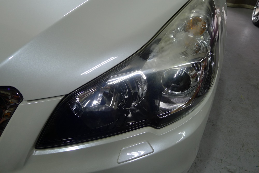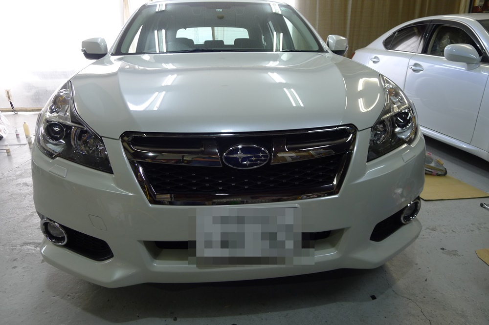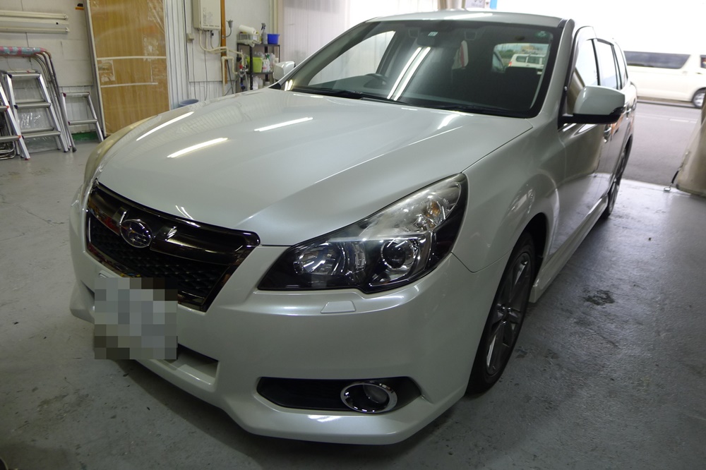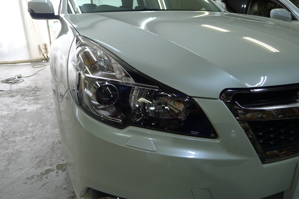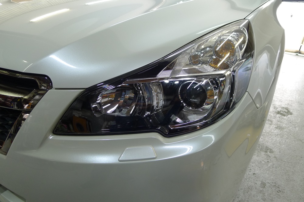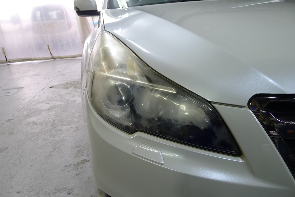 スバル レガシーセダンのヘッドライトクスミ落としで入庫です