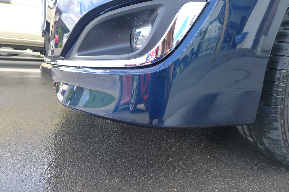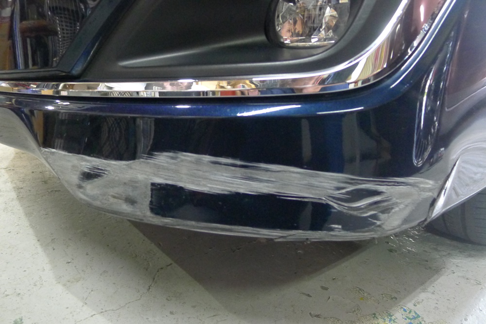 フロントバンパー左角の下部分をぶつけてしまったそうで擦り傷が入って割れてしまっています