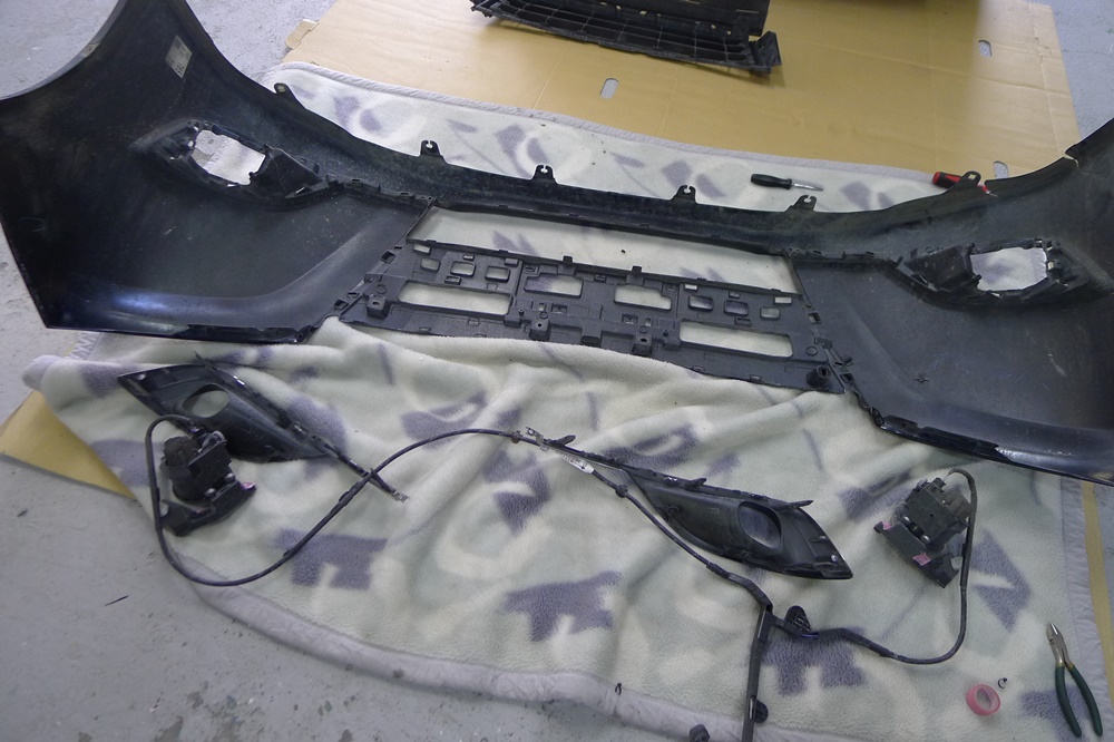 まずは損傷してしまったバンパーを外し、フォグやグリルなどのパーツを外していきます