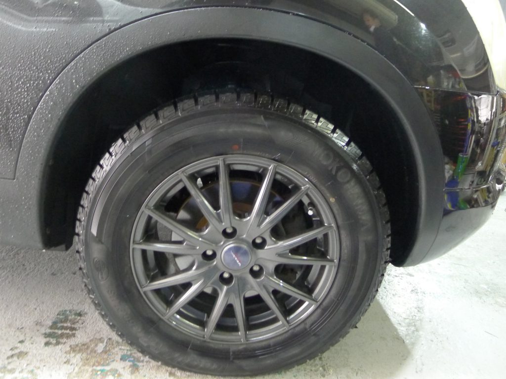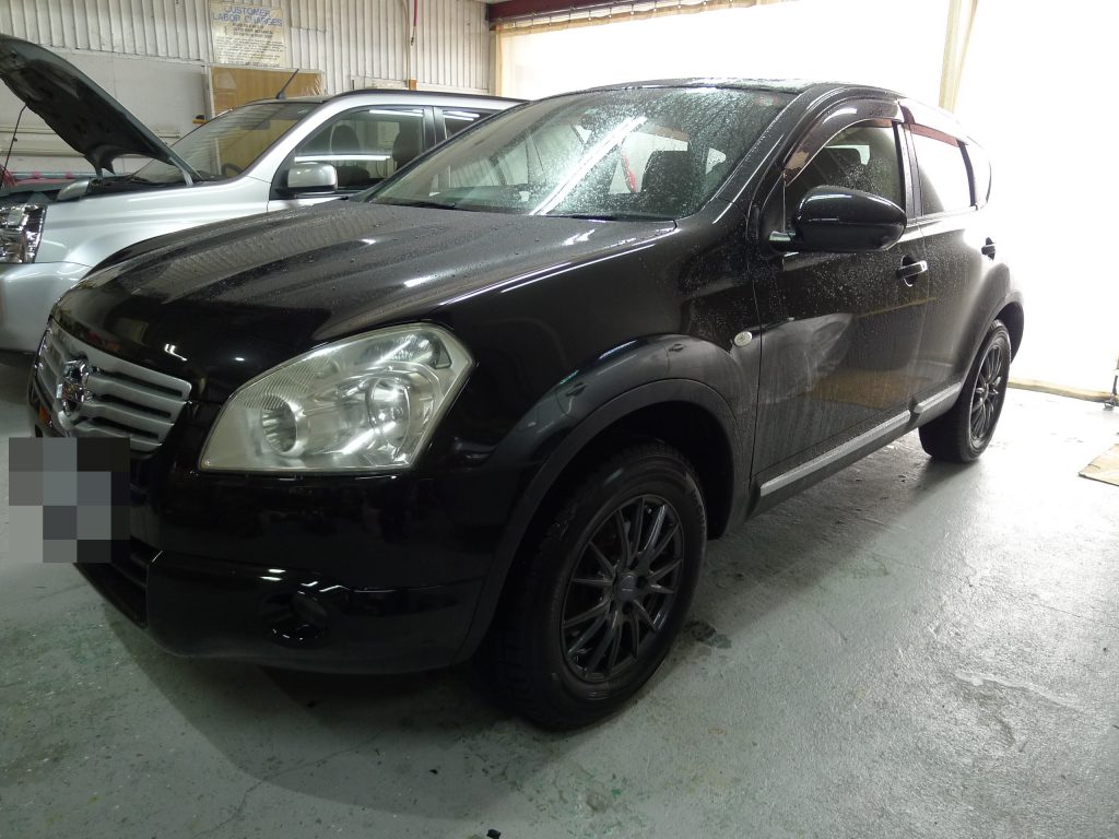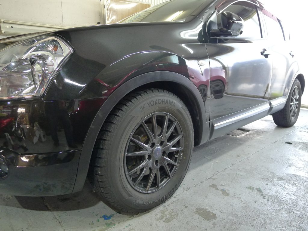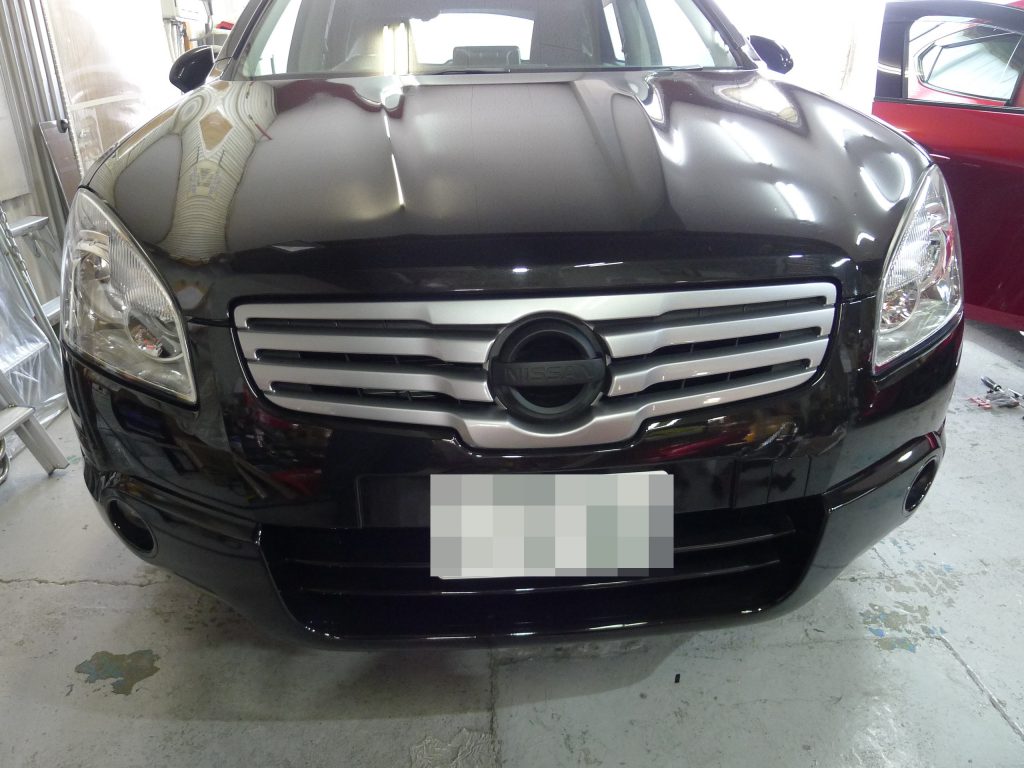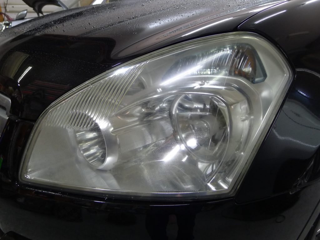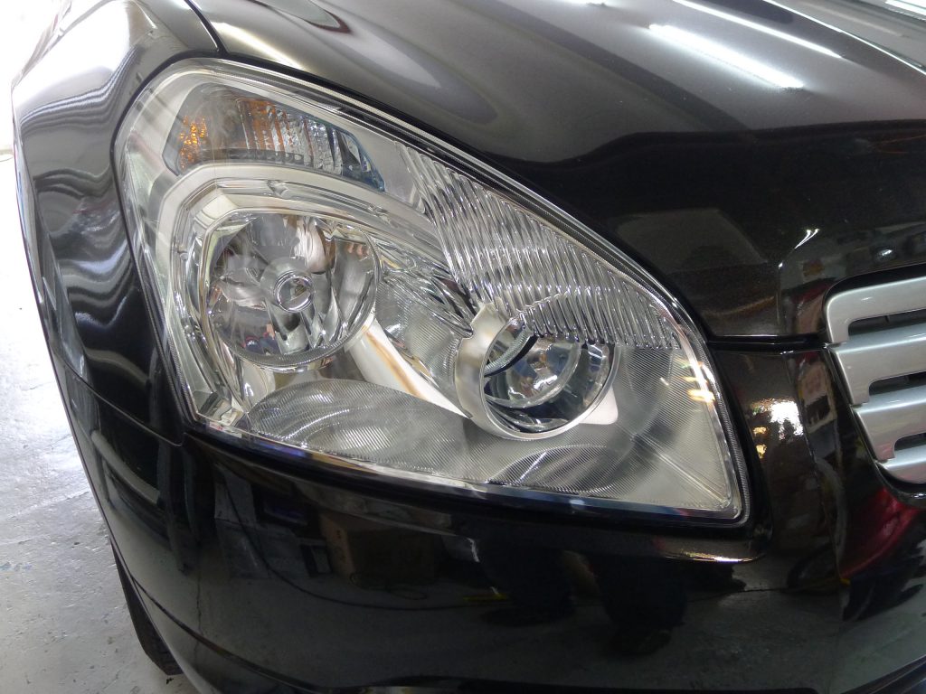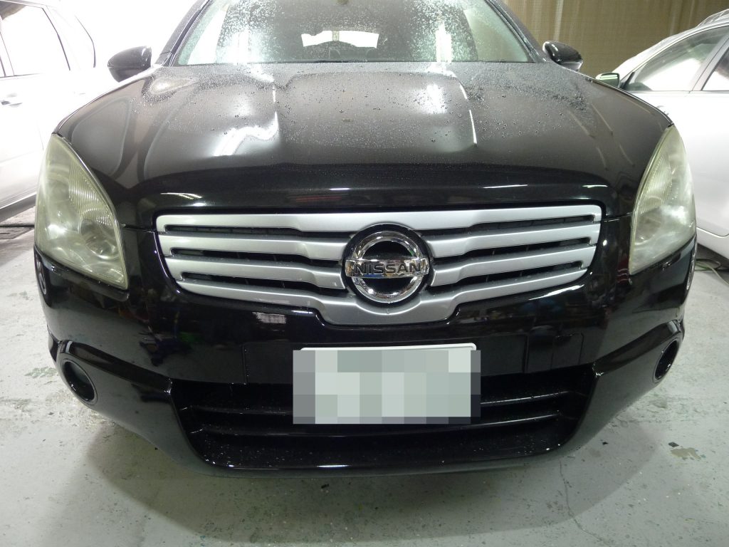ニッサン デュアリスのヘッドライト再生コーティングと持込商品のダウンサス、ブラックエンブレムの取付です