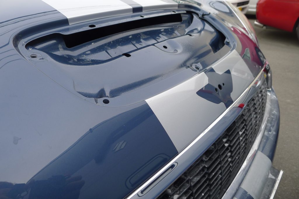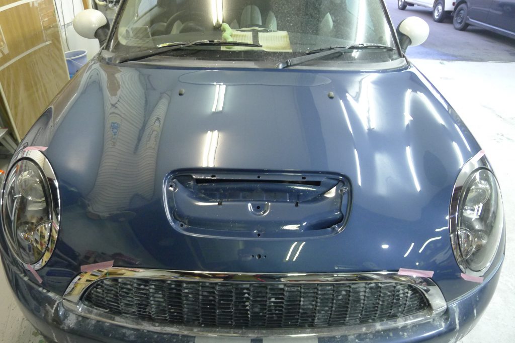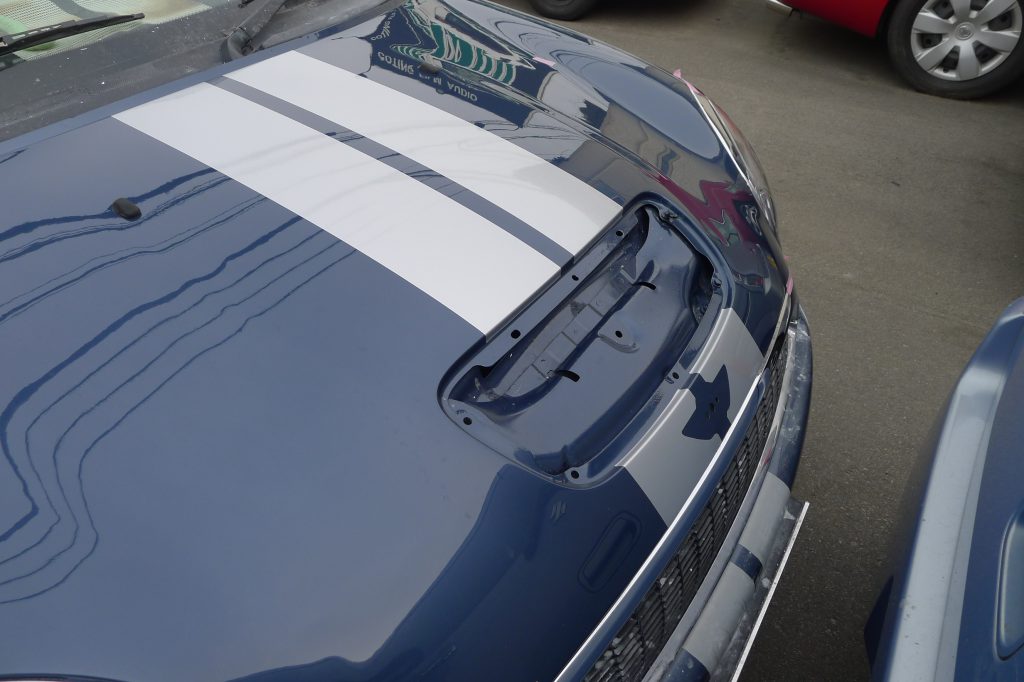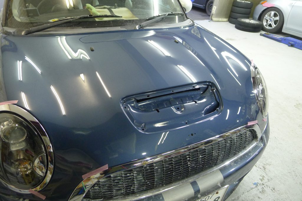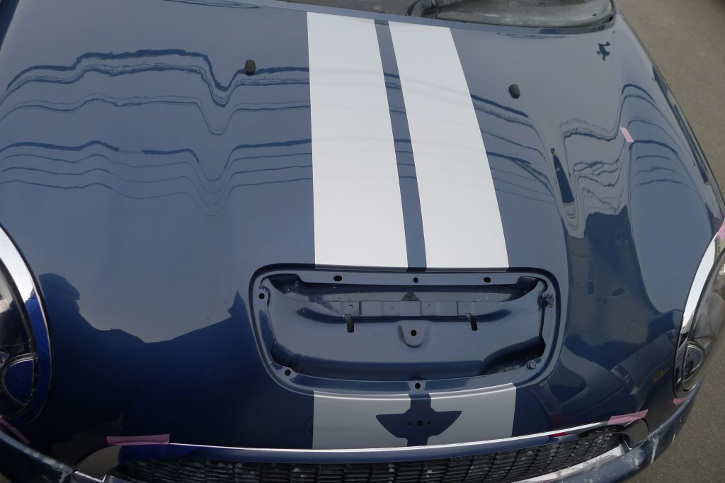 ボンネットストライプ製作依頼のミニクーパー 色あせによりボンネットの塗り直し後ストライプ製作施工です 採寸をし製作、施工をいたしました ミニマーク部分もしっかりと型取り、施工いたしました この後、パーツを取付て元に戻して完成です