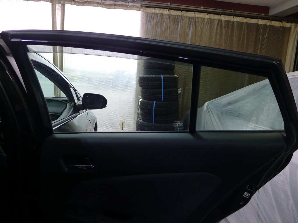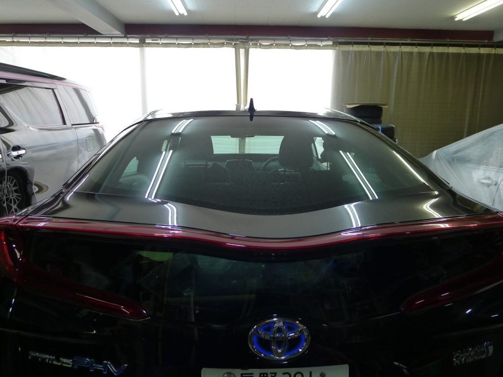 トヨタ プリウスPHVカーフィルム施工です プリウスPHVの特徴のリアガラスダブルバブルウインドウ空気抵抗を減らして空力特性を向上する効果らしいですパッと見、貼れるの?と思わせる形状になっていますがしっかり1枚貼りです
