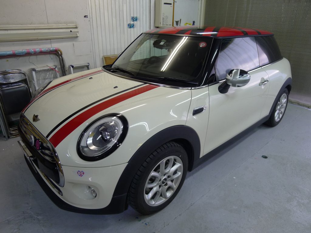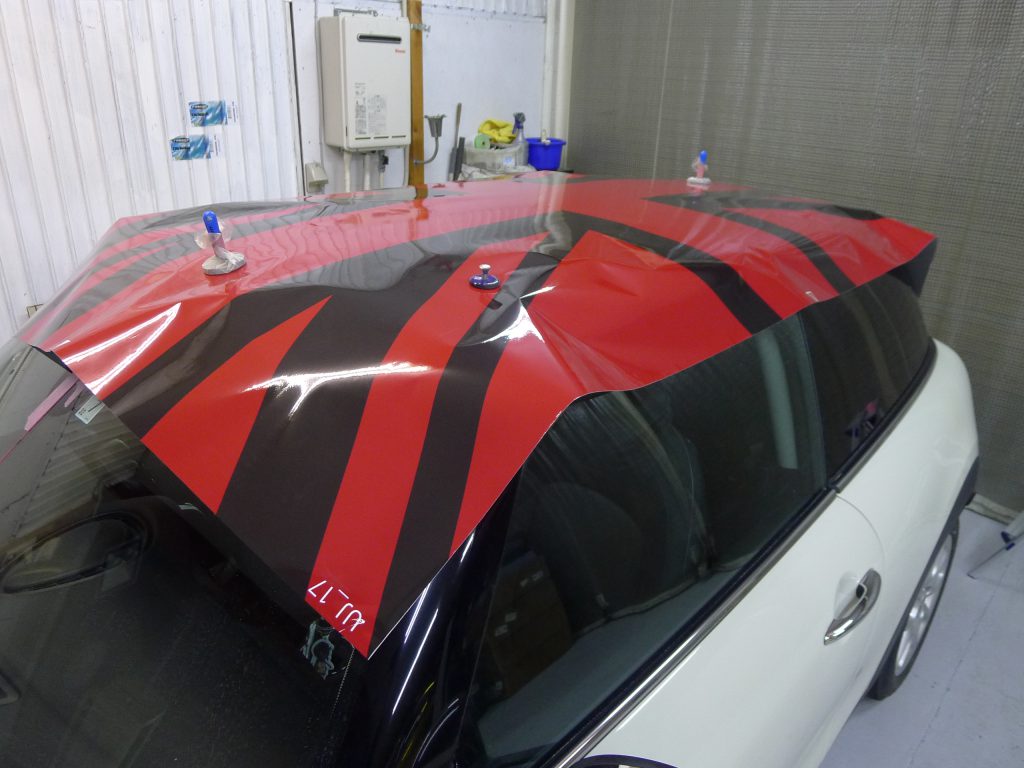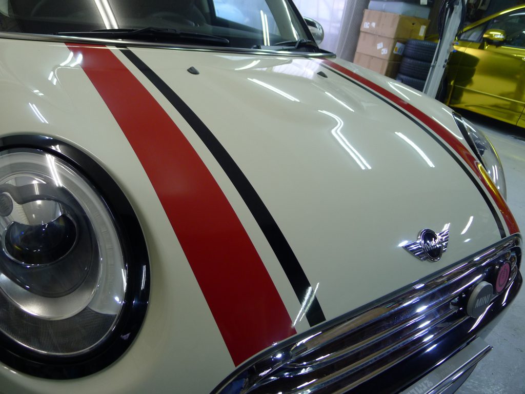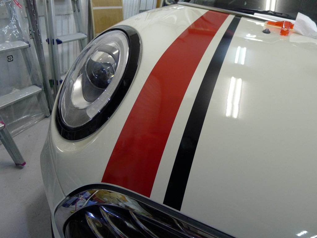同色で赤、黒でボンネットストライプはオリジナル製作で施工です