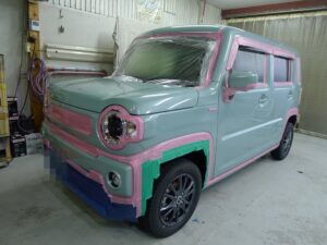 当店はエンジンルーム内から巻き上がるミストもしっかり保護するためエンジンルーム内の養生を行い外観の養生になります
