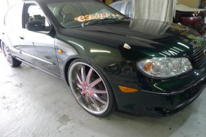 費用を抑えたいとのことで樹脂モールは交換、ドア、フェンダーは磨き、筆差しでの修理です