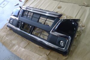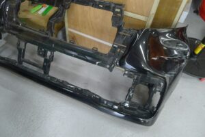 損傷したフロントバンパーを外し、メッキモール等を移植